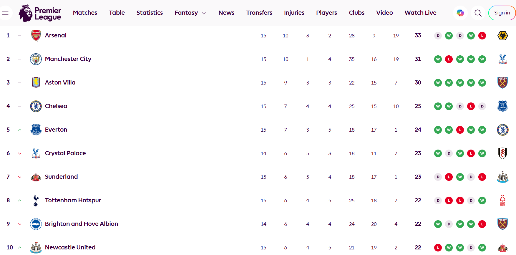 Với các kết quả trên, Arsenal vẫn giữ được ngôi đầu bảng với 33 điểm. Tuy nhiên, sau chiến thắng trước Sunderland, Man City đã lấy lại vị trí thứ 2 từ chính đội bóng vừa đánh bại Arsenal là Aston Villa, rút khoảng cách với vị trí đầu bảng chỉ còn 2 điểm.