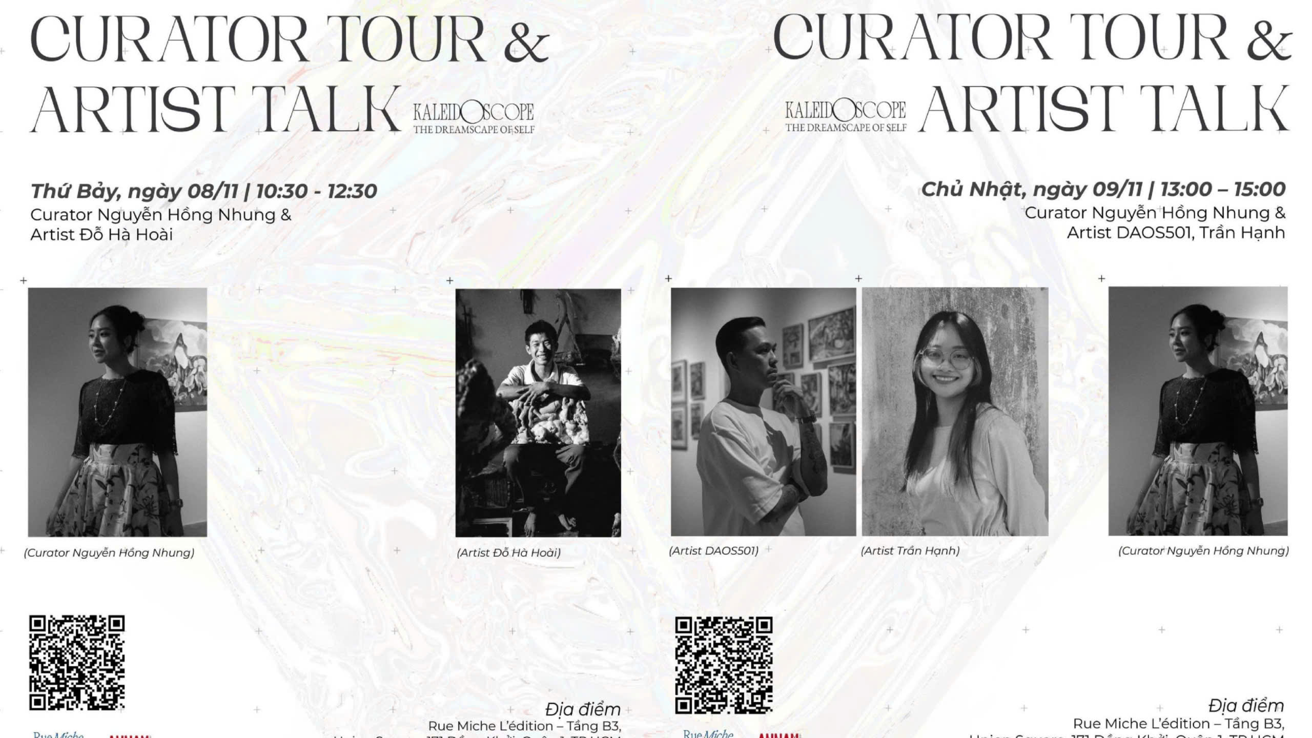 Triển lãm “Kaleidoscope – The Dreamscape of Self” mở cửa tự do, diễn ra từ ngày 21.10 đến hết ngày 23.11.2025, trong khung giờ từ 10 giờ đến 21 giờ hằng ngày, tại Rue Miche L’édition, tầng hầm B3 Trung tâm thương mại Union Square (171 Đồng Khởi, phường Bến Nghé, Quận 1 cũ). Đây hứa hẹn sẽ là điểm đến nghệ thuật đầy cảm hứng, nơi công chúng có thể tự do đắm mình trong không gian sắc màu và cảm xúc của những nghệ sĩ đương đại Việt Nam.
