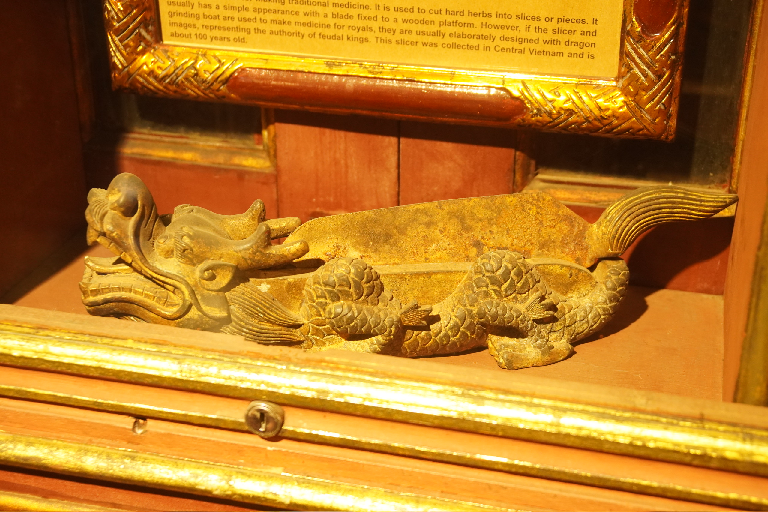 Thuyền tán – dụng cụ tán thuốc khô thành dạng bột mịn. Để bào chế thuốc cho vua, thuyền tán hay dao cầu được thiết kế cầu kỳ, thường có hình rồng tượng trưng cho quyền lực của vua chúa thời phong kiến – Ảnh: Tuấn Kiệt
