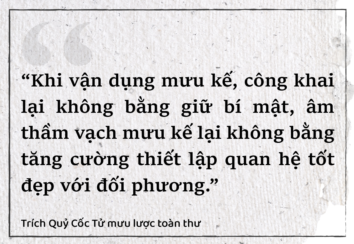 Thánh nhân thường giữ kín mưu lược, còn kẻ thiếu tinh tế lại hay phô trương. Người biết kìm nén cảm xúc, không bộc lộ yêu ghét mới có thể được giao việc lớn. Việc đã mất khó khôi phục, nguy nan khó đổi thành an toàn, chỉ có âm thầm vận dụng mưu lược mới tránh được rủi ro. “Phép tắc đối nhân xử thế của thánh nhân cũng tinh tế ở chỗ giấu kín”, không dựa vào hình thức đạo đức bề ngoài, mà dựa trên sự phù hợp với quy luật vận động và tính thực tiễn. Quan điểm này của Quỷ Cốc Tử có sự tương đồng với tư tưởng của nhà chính trị Niccolò Machiavelli (1469–1527) – tác giả của kiệt tác Quân Vương – Thuật cai trị, một trong những đầu sách quý thuộc Tủ sách Nền Tảng Đổi Đời. Cả hai ông đều nhấn mạnh rằng để giành thắng lợi – trên chiến trường hay thương trường – cần mưu trí, chuẩn bị kỹ lưỡng, biết che giấu và vận dụng linh hoạt nguyên tắc đúng thời điểm.