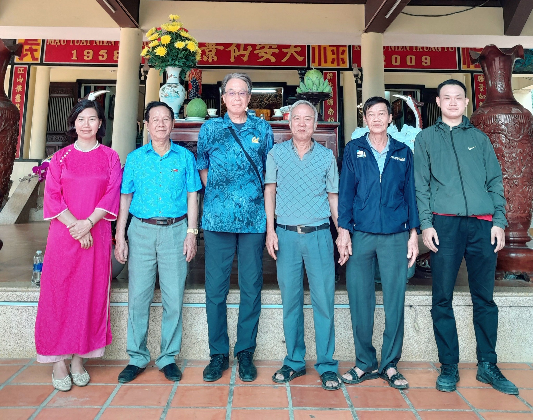 Phan Kim Hùng (ngoài cùng bên phải) cùng các nhà nghiên cứu trong và ngoài nước khảo sát Am Chúa (Diên Khánh) – nơi có bút tích của Tiến sĩ Phan Thanh Giản – Ảnh NVCC
