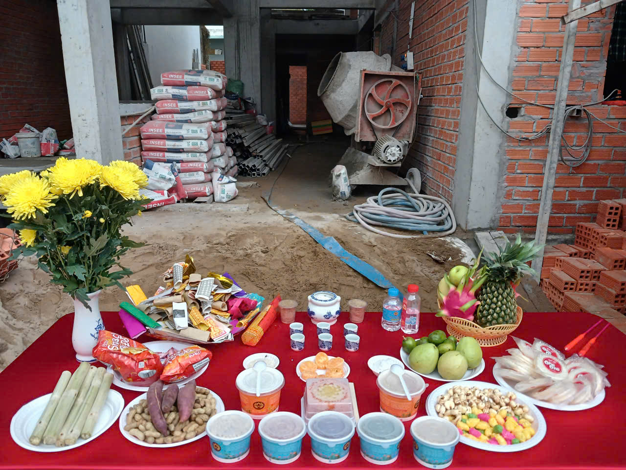 Mâm cúng cô hồn tại công trình – Ảnh: Nữ Trương
