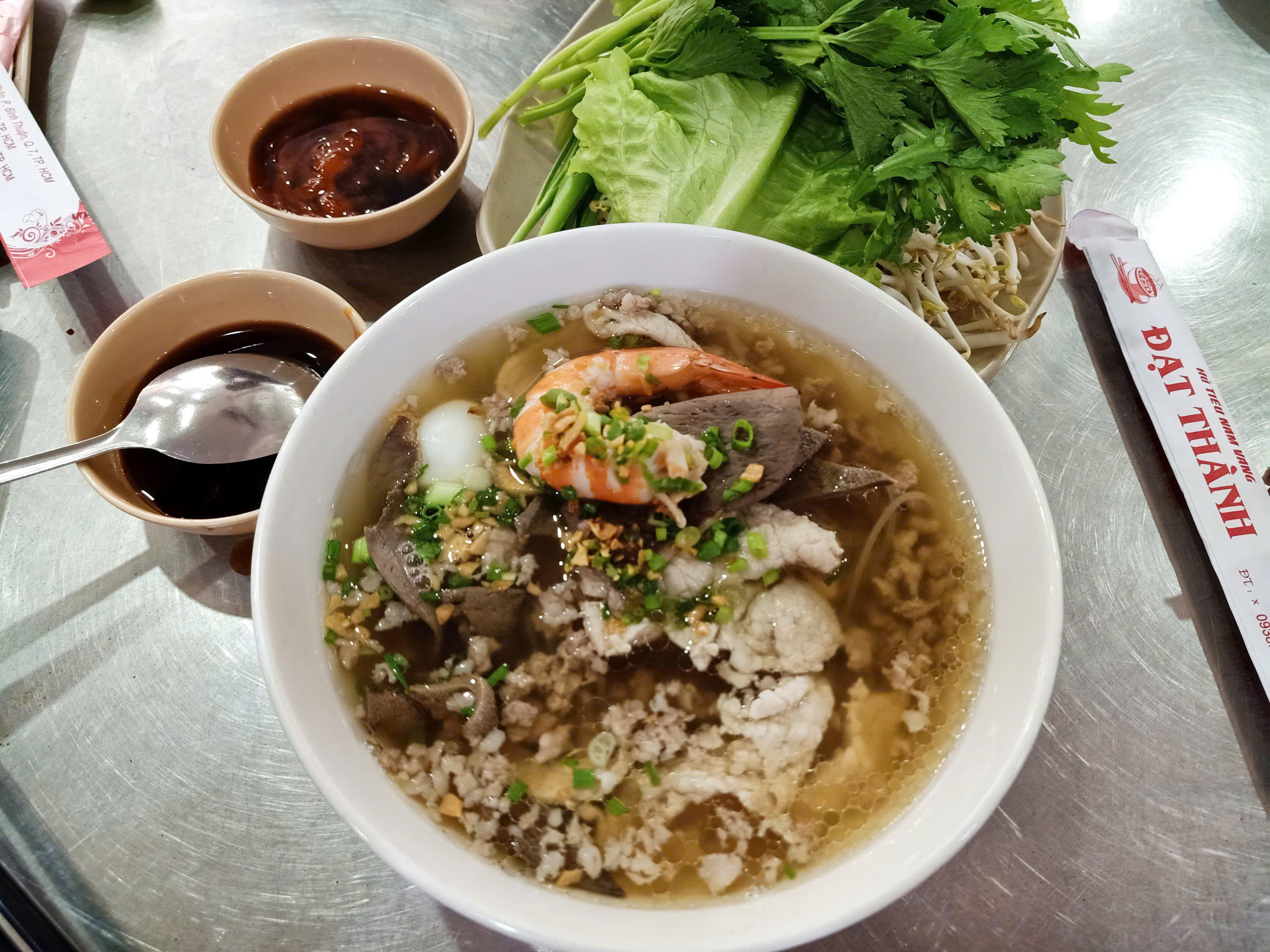 “Có thực mới vực được đạo”, vì vậy tôi quyết định ăn sáng trước đã. Quán ăn mà tôi chọn đó là hủ tiếu Đạt Thành, nằm trên đường Nguyễn Thị Thập, Phường Tân Thuận, TP. Hồ Chí Minh. Tôi khá thích nơi này vì không gian thoáng đãng, mát mẻ, cách bày trí vô cùng gọn gàng, ngăn nắp. Dù mới sáng sớm nhưng quán đã rất đông, dòng người ra vào nườm nượp nên tôi phải đợi một chút thì món ăn mới được bưng lên.