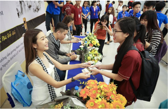 Các khách mời ký tặng sách cho sinh viên trường Đại học Nguyễn Tất Thành.