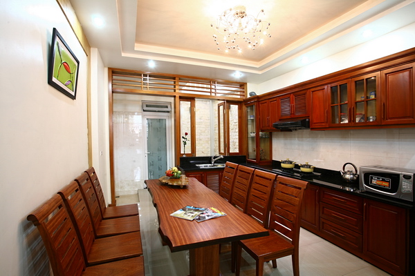 Gỗ là chất liệu chủ đạo trong phòng ăn, từ hệ thống cửa, hệ thống tủ bếp, bàn ăn. Bàn ăn ở đây là một tấm gỗ nguyên khối.