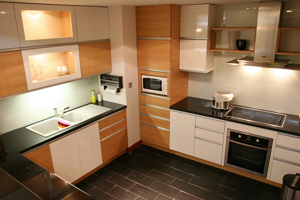 Tủ bếp trong nhà ở hiện đại làm bằng gỗ công nghiệp, mang sắc thái đơn giản,sang trọng, nhã nhặn.