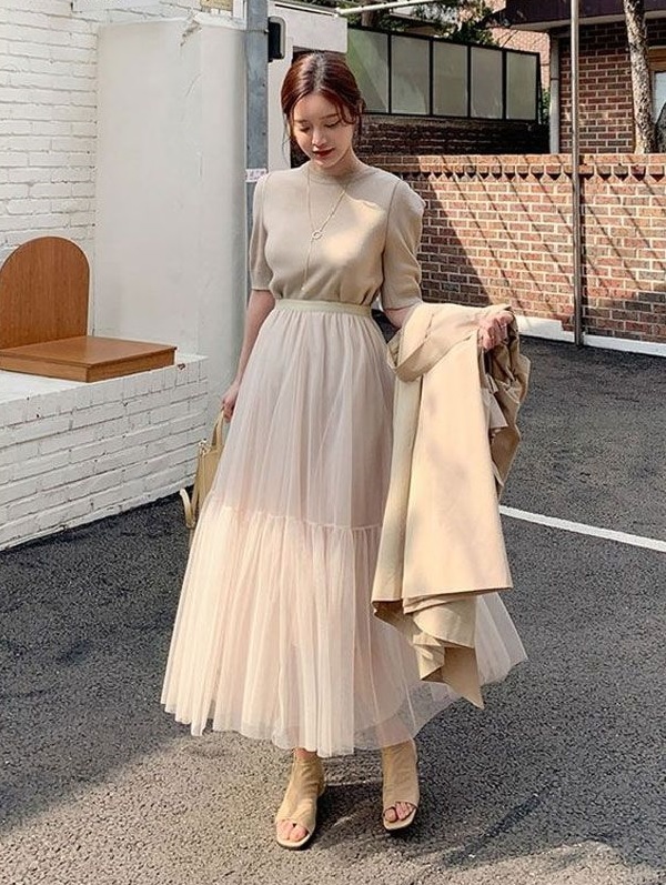 Những ngày thời tiết se lạnh, một chiếc áo dệt kim phối cùng chân váy voan là sự kết hợp vô cùng lý tưởng dành cho bạn. Chân váy voan có thiết kế xòe bồng, hãy chọn những chiếc áo dệt kim có thiết kế ôm gọn để tăng thêm sự cân bằng cho tổng thể nhé.