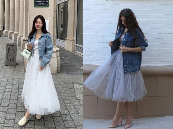 Bạn sẽ thật ấn tượng trong trang phục chân váy voan phối cùng denim.