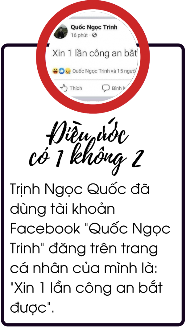 Điều đáng nói, cách thời điểm bị lực lượng công an lập biên bản 9 ngày, vào lúc 21 giờ 39 phút, ngày 4.3, Trịnh Ngọc Quốc đã dùng tài khoản Facebook “Quốc Ngọc Trinh” đăng trên trang cá nhân của mình là: “Xin 1 lần công an bắt được”. Đến nay thì điều ước này đã thành hiện thực.