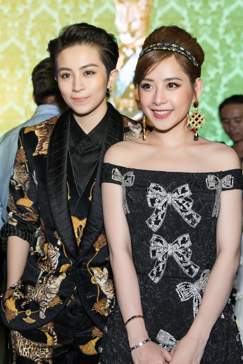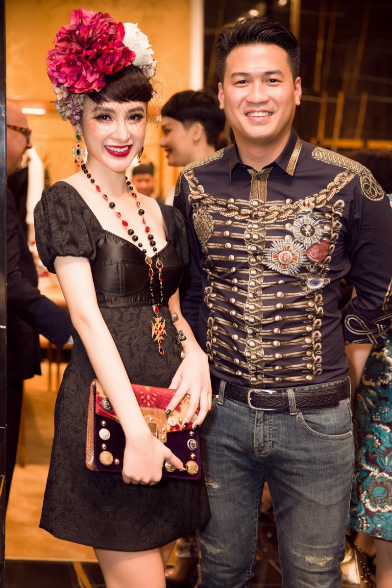 Diễn viên Angela Phương Trinh “chịu khó” đội hẳn một chiếc mũ cầu kỳ để tạo điểm nhấn cho tổng thể trang phục. Doanh nhân Phillip Nguyễn mặc áo sơ mi Dolce & Gabbana với họa tiết mô phỏng trang phục hoàng gia phối cùng quần jeans khỏe khoắn.