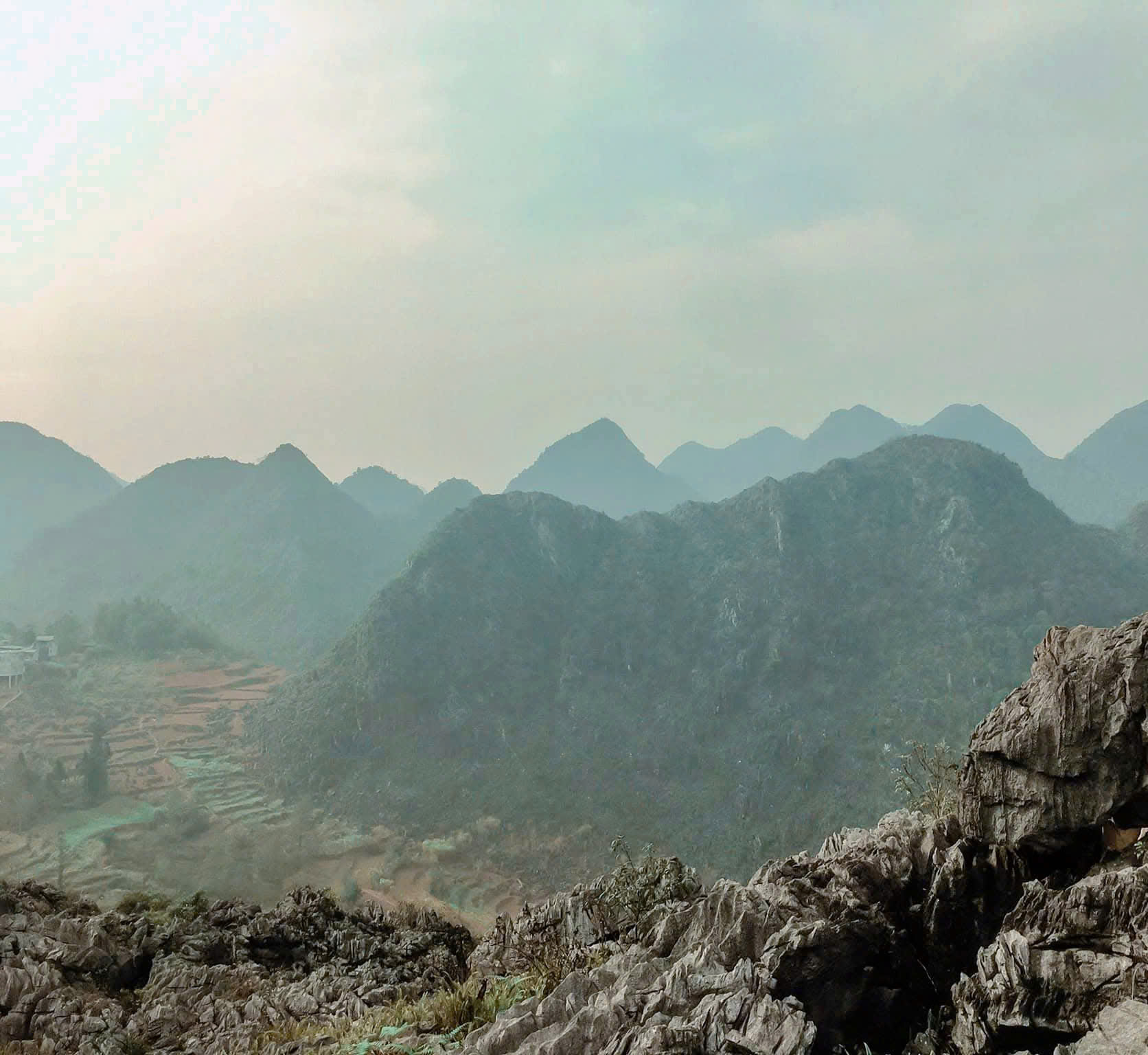 Đặt chân trên đỉnh núi, bạn có thể thỏa sức nhìn ra xa, chiêm ngưỡng khung cảnh bao la của cao nguyên đá Đồng Văn với những thung lũng xanh mướt, những ngôi nhà của người đồng bào ẩn hiện dưới chân núi – mộc mạc, giản dị mà thân thương.
