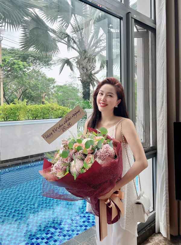 Bảo Thy tươi tắn cùng món quà ông xã tặng nhân ngày Phụ nữ Việt Nam. Nữ ca sĩ hào hứng chia sẻ: “Chúc các chịem mình ngày 20/10 thật hạnh phúc ạ. “Phụ nữ là để nâng niu””.