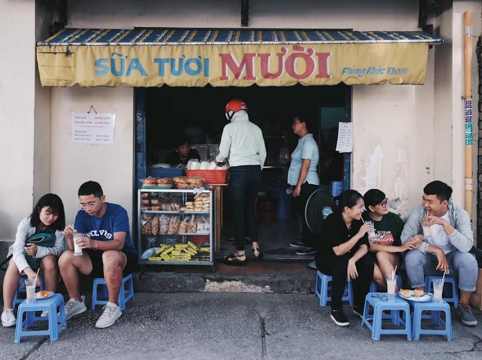 Quán sữa Mười chỉ có vài cái ghế đẩu trên vỉa hè nhưng lại cực kì đông khách – Ảnh: Leon218