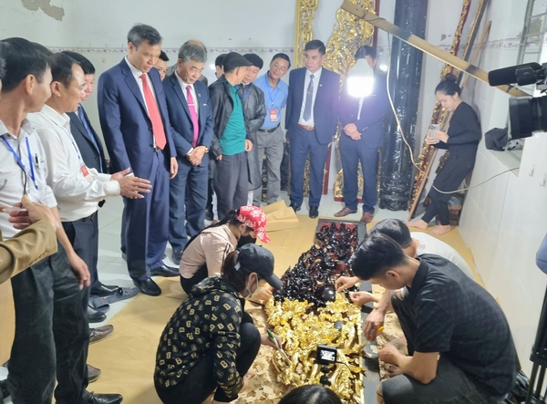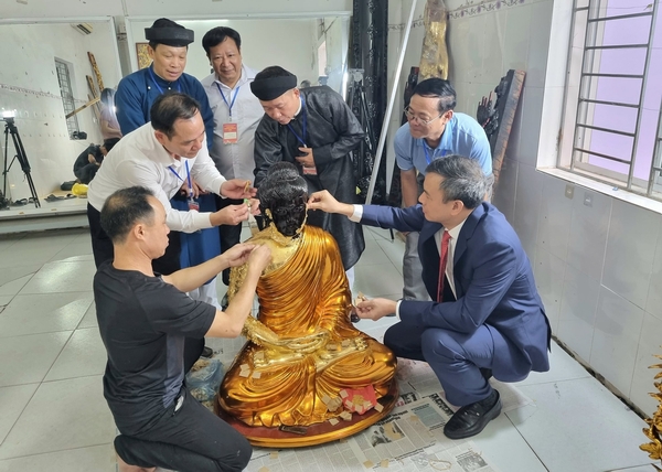 Các đại biểu, khách tham quan trải nghiệm thếp vàng tượng Phật cùng nghệ nhân.