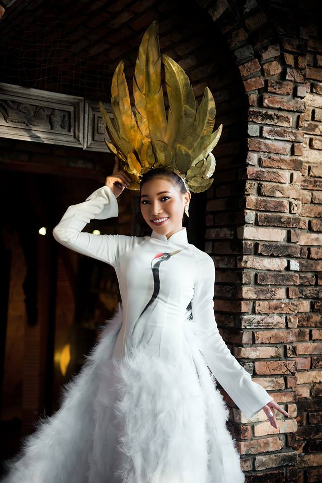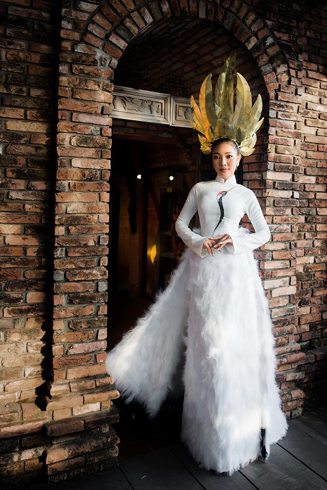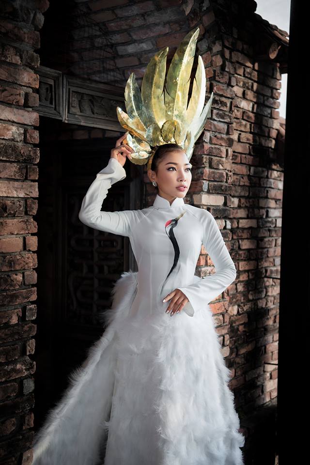 Đại diện Việt Nam chọn bộ áo dài màu trắng lấy ý tưởng từ chim hạc của NTK Tấn Hòa cho phần thi trang phục dân tộc.