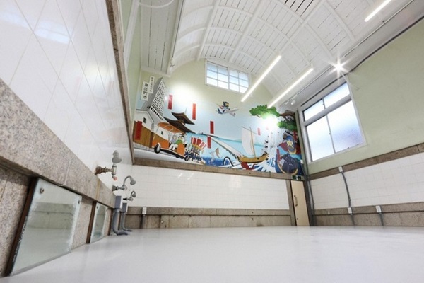 Ông Masaru Nakaoka mô tả, khu nhà tắm Asahi-yu vốn được chia là 2 phần cho nam và nữ rõ rệt. Ở phòng tắm nam, thì có một sàn phẳng được thiết kế phía trên bồn cũ. Xung quanh các vách tường, được trang trí bằng những bức phác họa, giúp tạo cho không gian nơi đây đem đến cho khách một bầu không khí thoải mái, cảm thấy đầu óc thư thái.