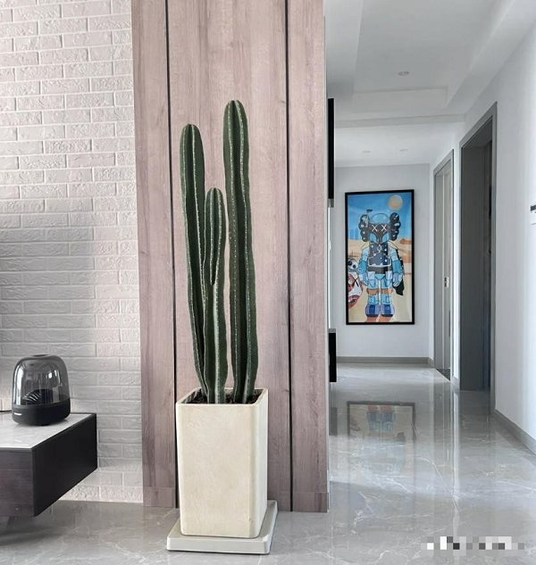 Với các phòng khách có diện tích đủ rộng, có thể chọn cây xương rồng trụ để chưng trong nhà. Xương rồng trụ có dáng thẳng vươn cao khá ấn tượng, đây sẽ là điểm nhấn khiến ngôi nhà của bạn trở nên đặc biệt. Loại cây này thường mất nhiều thời gian để phát triển thành cây cao, vì thế bạn nên chọn chậu bằng xi măng, dùng cát sông để trồng giúp cây khỏe mạnh và nhanh lớn.