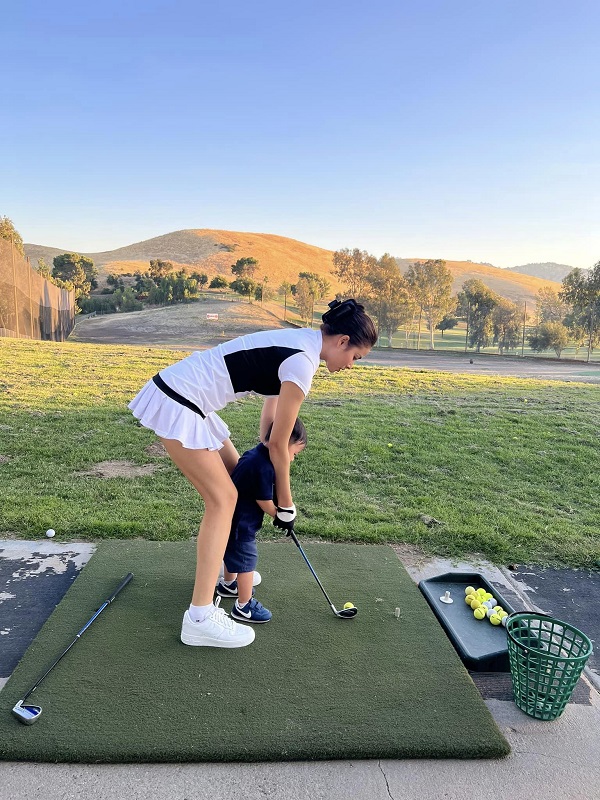 Hoa hậu Phạm Hương đưa con trai 3 tuổi chơi golf.