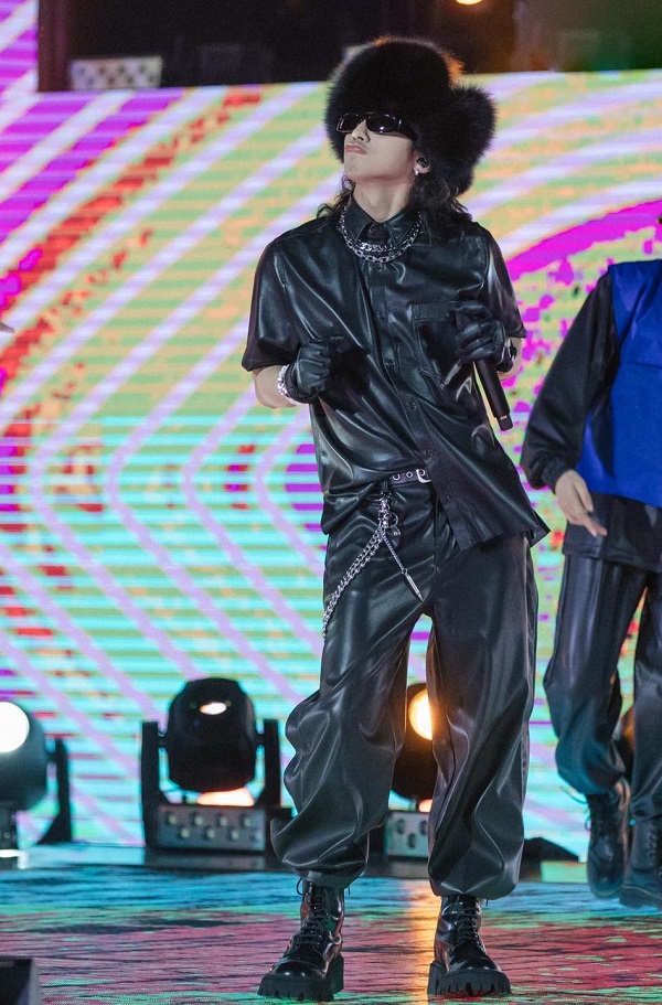 Bất chấp thời tiết, Sơn Tùng đội nón lông trình diễn trên sân khấu.